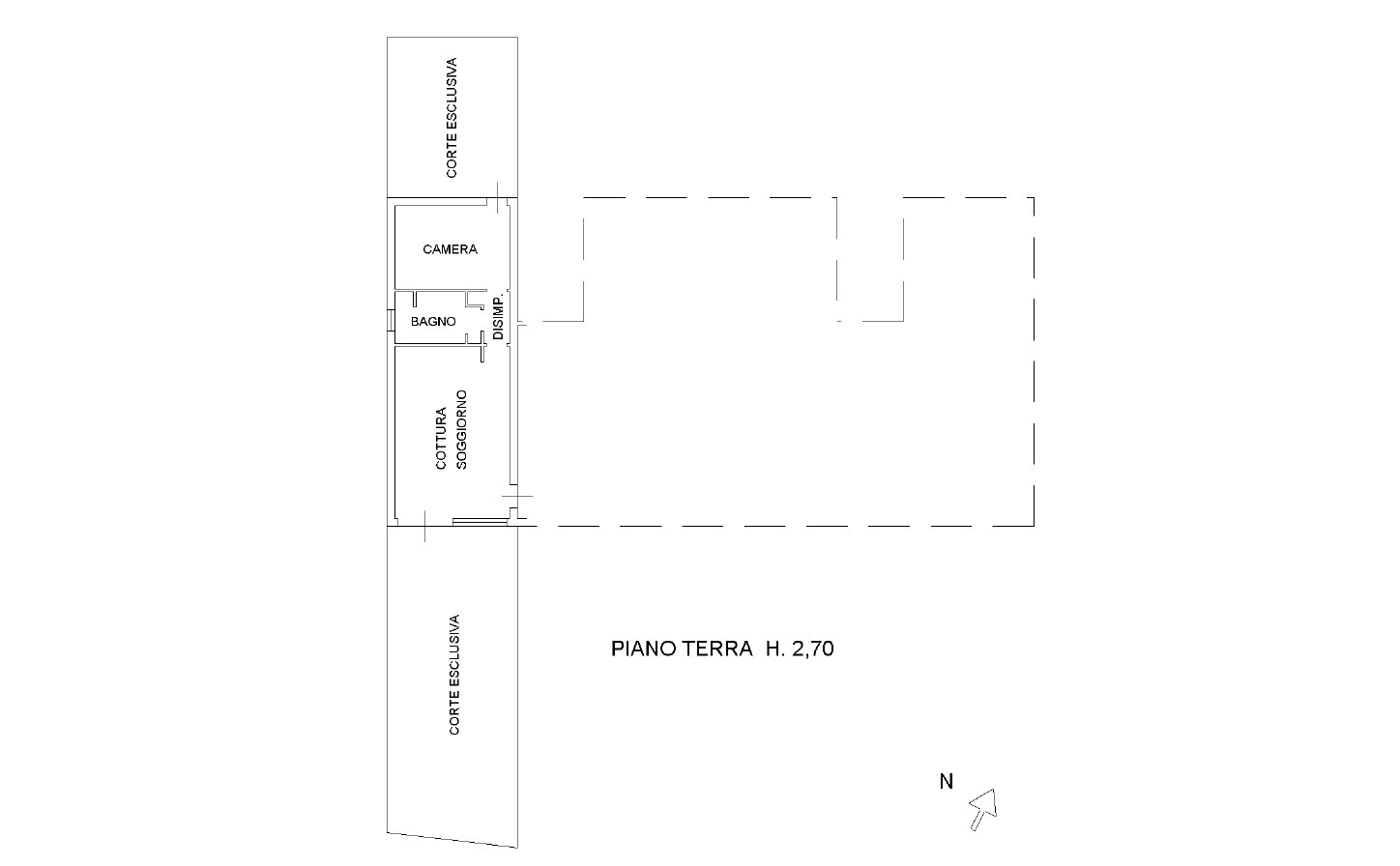 L'abitazione è composta da: ingresso su ampia zona giorno, molto luminosa grazie alla splendida vetrata che da sul giardino sul lato sud, disimpegno con armadio su misura, bagno e camera matrimoniale con uscita sulla seconda area scoperta al piano terra; grande garage al piano interrato; posto auto esterno nell’area condominiale chiusa e recintata.